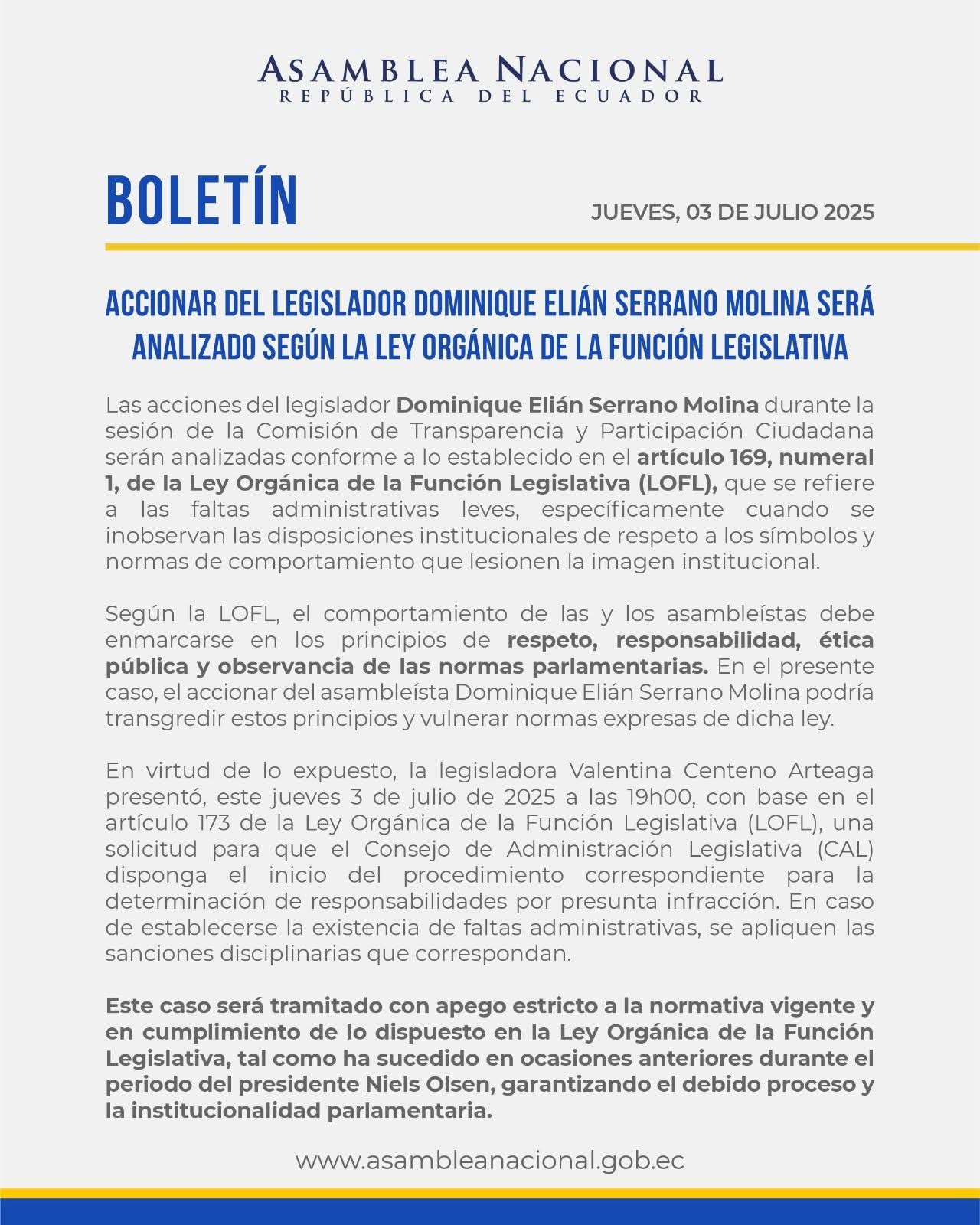 Boletín | Accionar del legislador Dominique Serrano será analizado según la Ley Orgánica de la Función Legislativa #LOFL. Más detalles ⤵️ Navegación de entradas Sierra y Amazonía afectadas por el invierno. Fuerte iinvierno.