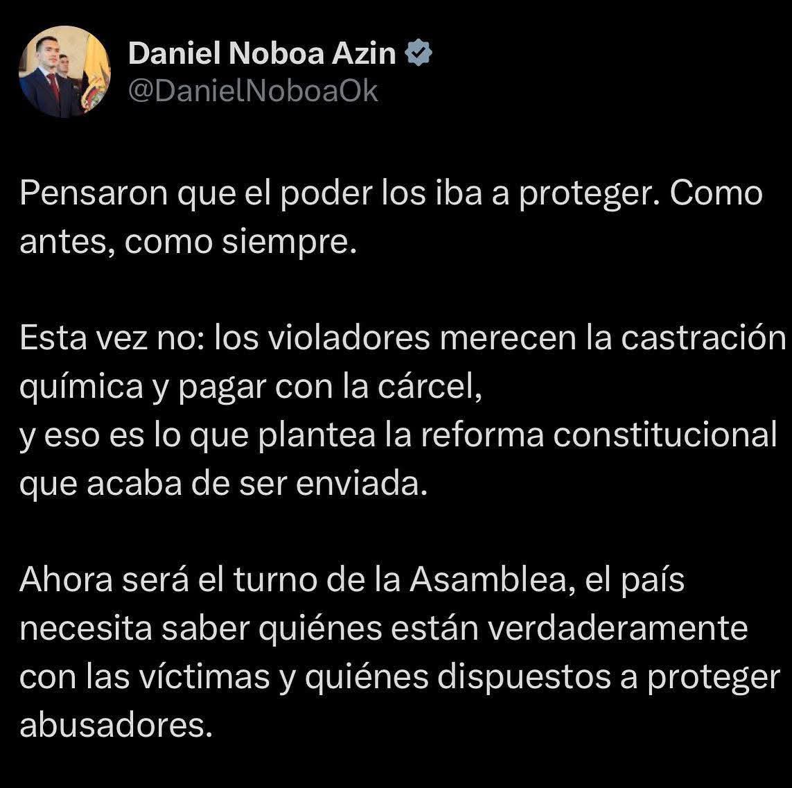 URGENTE || El Presidente de la República, Daniel Noboa, envió a la asamblea una reforma que consiste en castigar a los violadores con castración química y pena privativa de libertad.