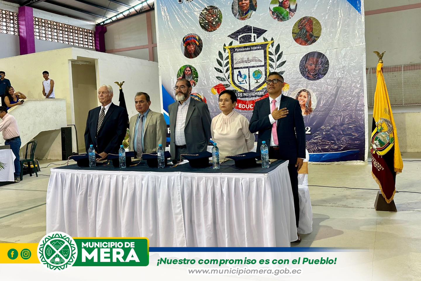 El alcalde Gustavo Silva, compartió esa alegría y felicitó a los nuevos bachilleres, motivando a los jóvenes a continuar por el buen camino, así mismo ratificó su compromiso de apoyo y trabajo en favor de la educación del cantón Mera.
