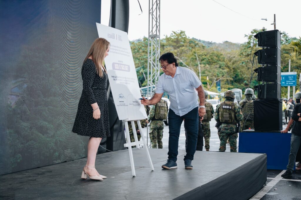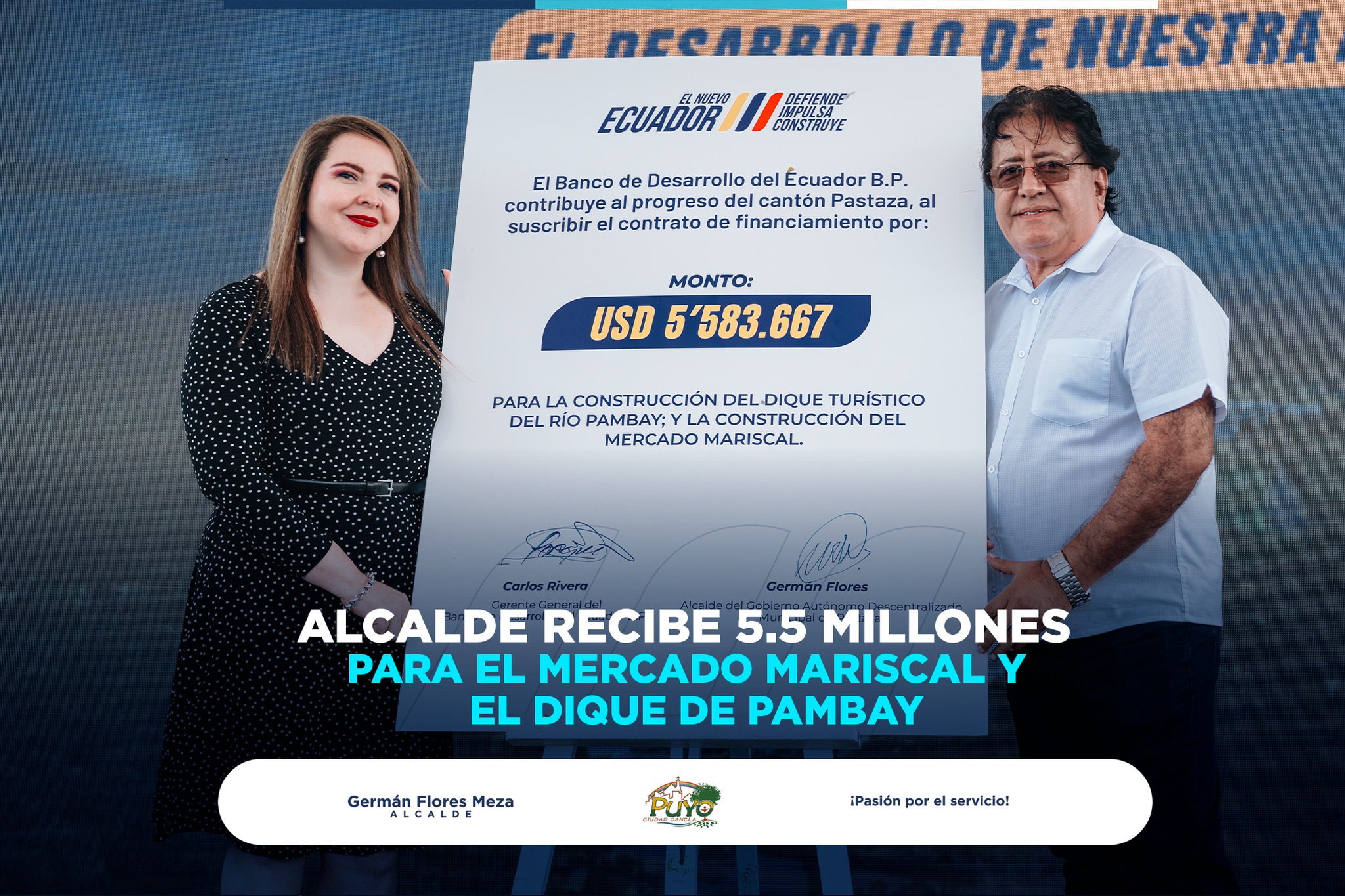 En un evento público organizado por el Gobierno Nacional y con la presencia de la vicepresidenta del Ecuador María José Pinto, el alcalde Germán Flores Meza y la gerente zonal del Banco de Desarrollo, Soraya Vasconez firmaron el contrato de financiamiento por un monto de $ 5’583.667 dólares para la construcción del nuevo Mercado Mariscal y el Parque Urbano Recreacional Dique del Pambay.