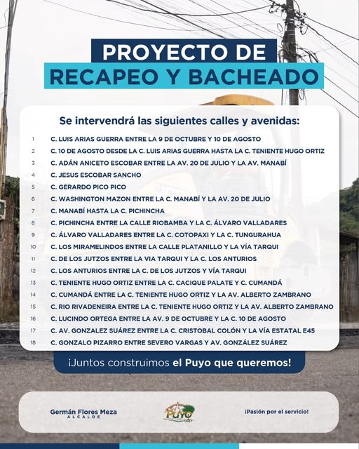 Desde este lunes iniciamos un amplio plan de bacheo y recapeo vial en varios sectores de la ciudad de Puyo, cumpliendo con nuestra responsabilidad y compromiso con el orden y la movilidad urbana.