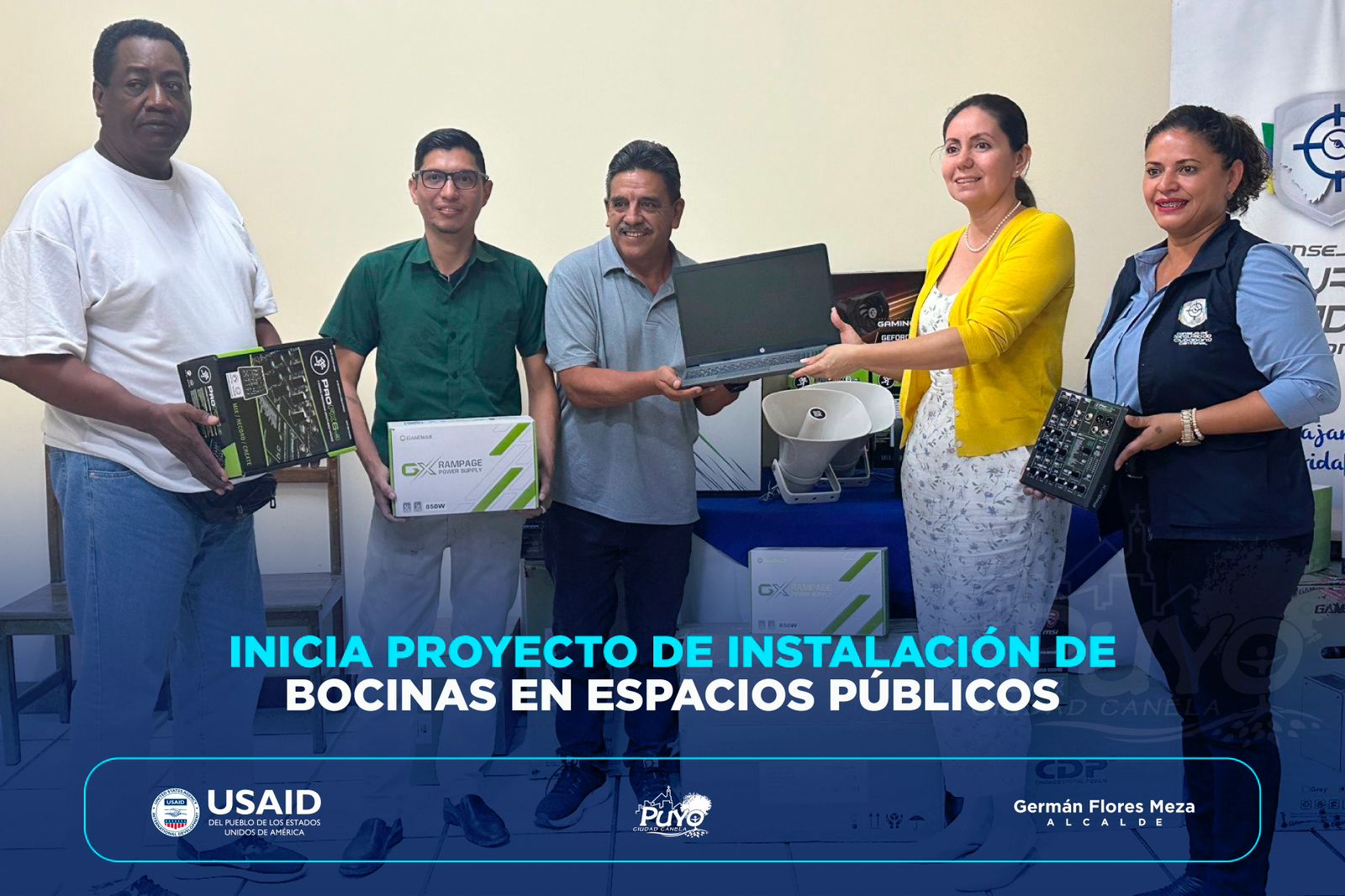La Concejal Mónica Meza, miembro de la comisión de Seguridad, entregó simbólicamente a los dirigentes barriales las bocinas que se instalarán en cuatro espacios públicos de la ciudad de Puyo, como parte de un proyecto que cuenta con apoyo de la Agencia de los Estados Unidos para el Desarrollo Internacional (USAID) @USAIDLAC.